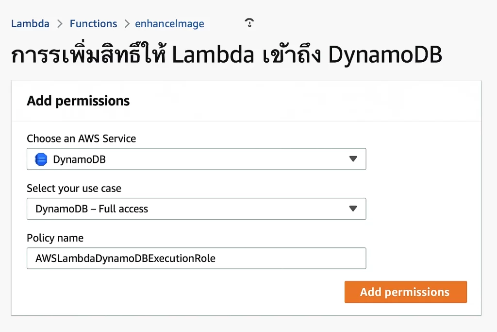 ขั้นตอนที่ 5: เพิ่มสิทธิ์ให้ Lambda เข้าถึง DynamoDB