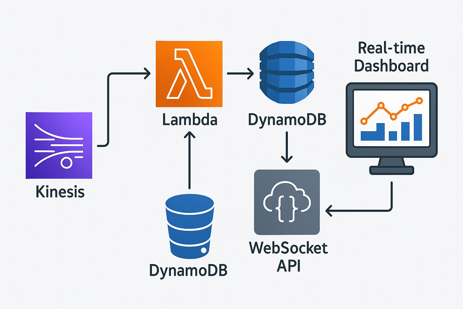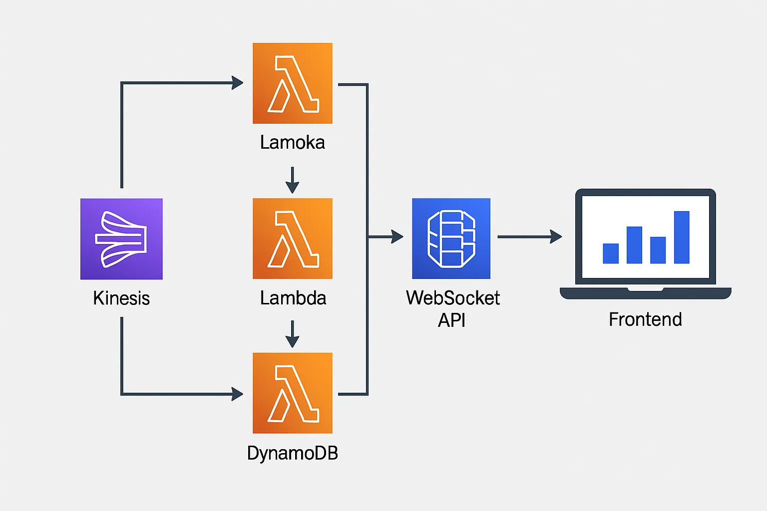 Lambda จะทำหน้าที่อ่านข้อมูลจาก Kinesis และบันทึกข้อมูลล่าสุดลงใน DynamoDB รวมถึงส่งข้อมูลอัปเดตไปยัง WebSocket API เพื่อแจ้ง Dashboard แบบเรียลไทม์